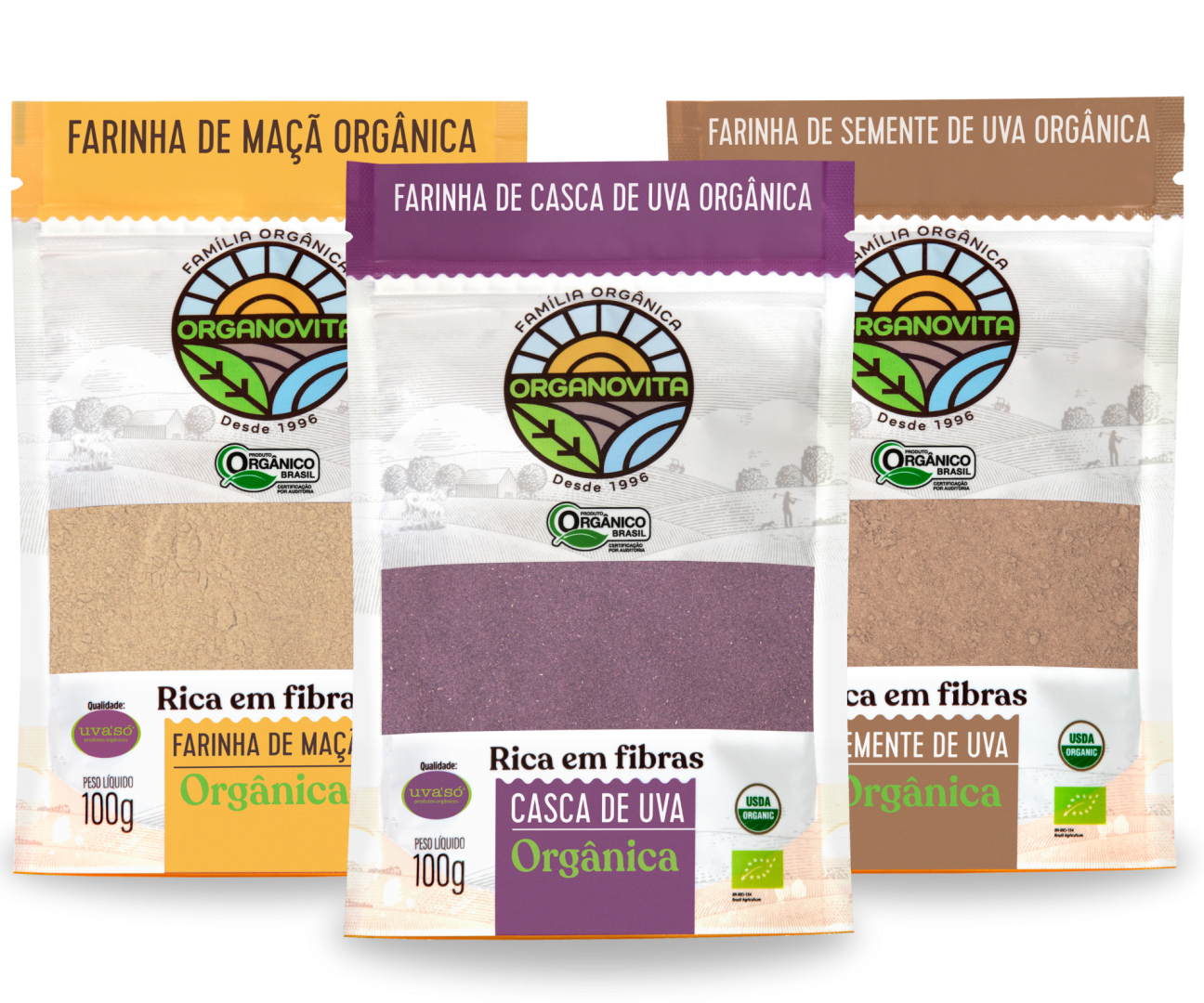 A farinhas funcionais surgem do upcycling inteligente dos sucos de uva e de maçã. Após o processo de extração do suco, as casca e as sementes são separadas, secas lentamente, com controle rigoroso de temperatura, e transformadas em farinhas ricas em fibras, antioxidantes e compostos bioativos.